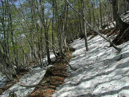 道がスイッチバックのように左右に走っている。雪が多いので我々は縦に、近道最短距離で頂上へ向かう。