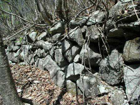 石垣が林の中に現れた。人工物(石垣)、神秘的な時間の流れを感じる。